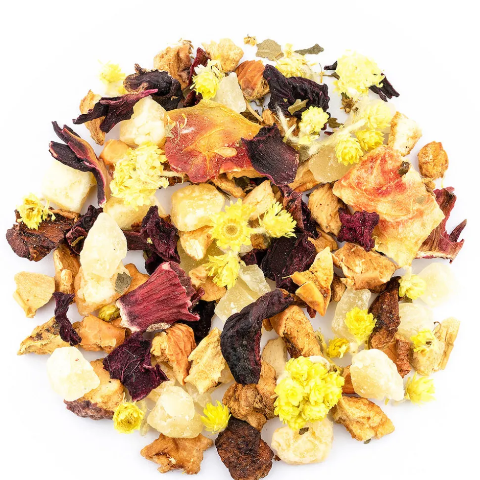 Zutaten: Apfelstücke, Ananaswürfel (Ananas, Zucker), Honigmelonenwürfel (Honigmelone, Zucker, Säuerungsmittel: Zitronensäure), Aroma, Wassermelonenflocken, Hibiskusblüten, Rote Beete, süße Brombeerblätter, Katzenpfötchen, Holunderblüten.