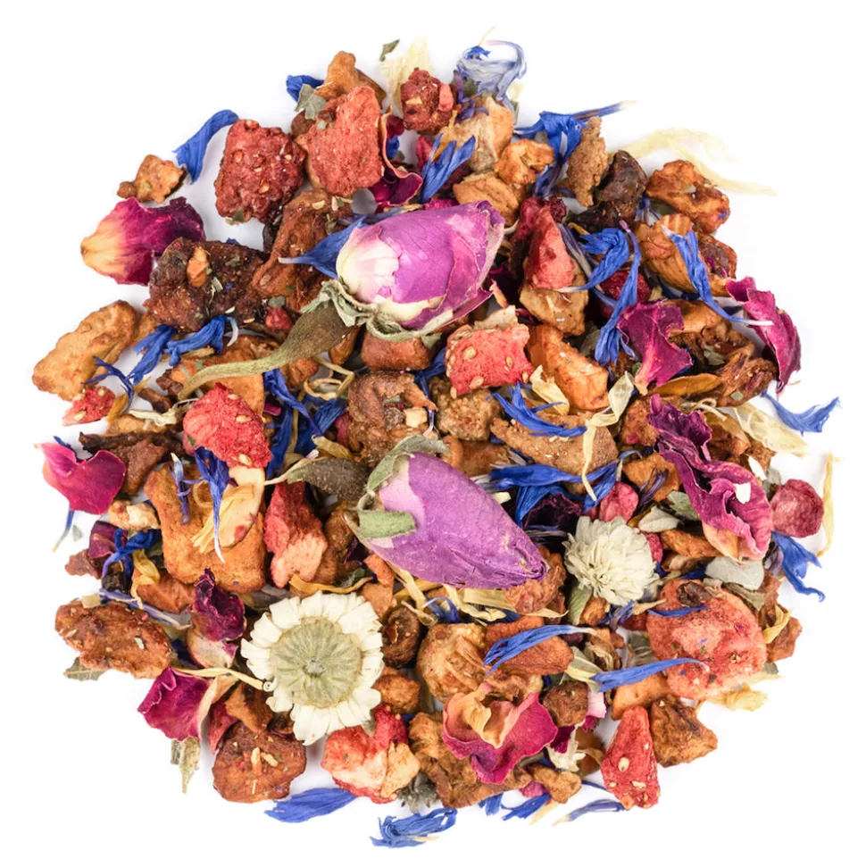 Zutaten: Apfelstücke, gesäuert (Apfel, Säuerungsmittel: Zitronensäure), Birnenstücke, pinke Rosenknospen, gefr.-getr. Erdbeerstücke, gefr.-getr. Himbeerstücke, Aroma, Brombeerblätter, blaue Kornblumenblüten, Ringelblumenblüten, Rosenblüten, römische Kamille.