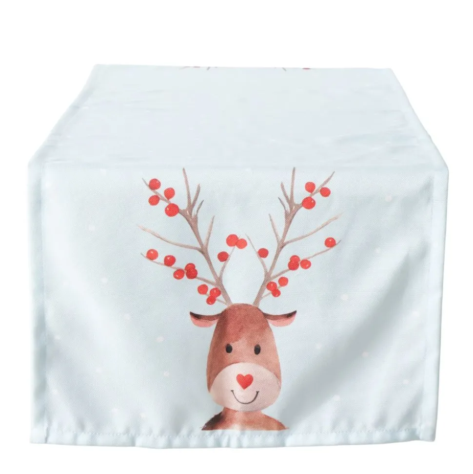 Mit seinem charmanten Rentier-Motiv bringt der hellblaue Tischläufer Rudolf winterliche Frische und festliche Gemütlichkeit auf Deinen Tisch. Die zarten Farben erinnern an verschneite Landschaften und verleihen Deinem Zuhause eine sanfte, liebevolle Weihnachtsstimmung. Ob als Mittelpunkt auf dem Esstisch, dem Sideboard oder der Kaffeetafel – Rudolf sorgt für ein stimmungsvolles Ambiente und lässt sich wunderbar mit Naturmaterialien, Kerzen oder Tannenzweigen kombinieren. Mach es Dir in der Winterzeit besonders schön und genieße die ruhigen Momente bei Plätzchenduft und Kerzenschein. Mit dem 140 x 40 cm großen Tischläufer wird jede Mahlzeit ein kleines Fest im Glanz der Weihnacht.