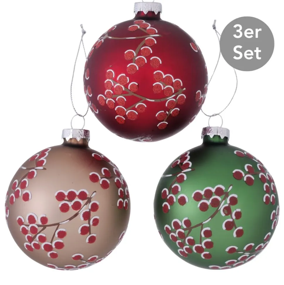 Verleihe Deinem Weihnachtsbaum einen Hauch von natürlicher Eleganz mit diesem stilvollen 3er-Set Weihnachtskugeln mit zartem Beeren-Motiv. Jede Kugel besteht aus edlem Glas und hat einen Durchmesser von 10 cm – groß genug, um schöne Akzente zu setzen, und fein genug, um sich harmonisch einzufügen. Die verschneiten Beeren bringen Farbe, Wärme und einen Hauch Nostalgie in Deine Festtagsdekoration. Ob am Baum, im Fenster oder als Teil eines Arrangements – diese Kugeln schaffen eine gemütliche, festliche Atmosphäre.