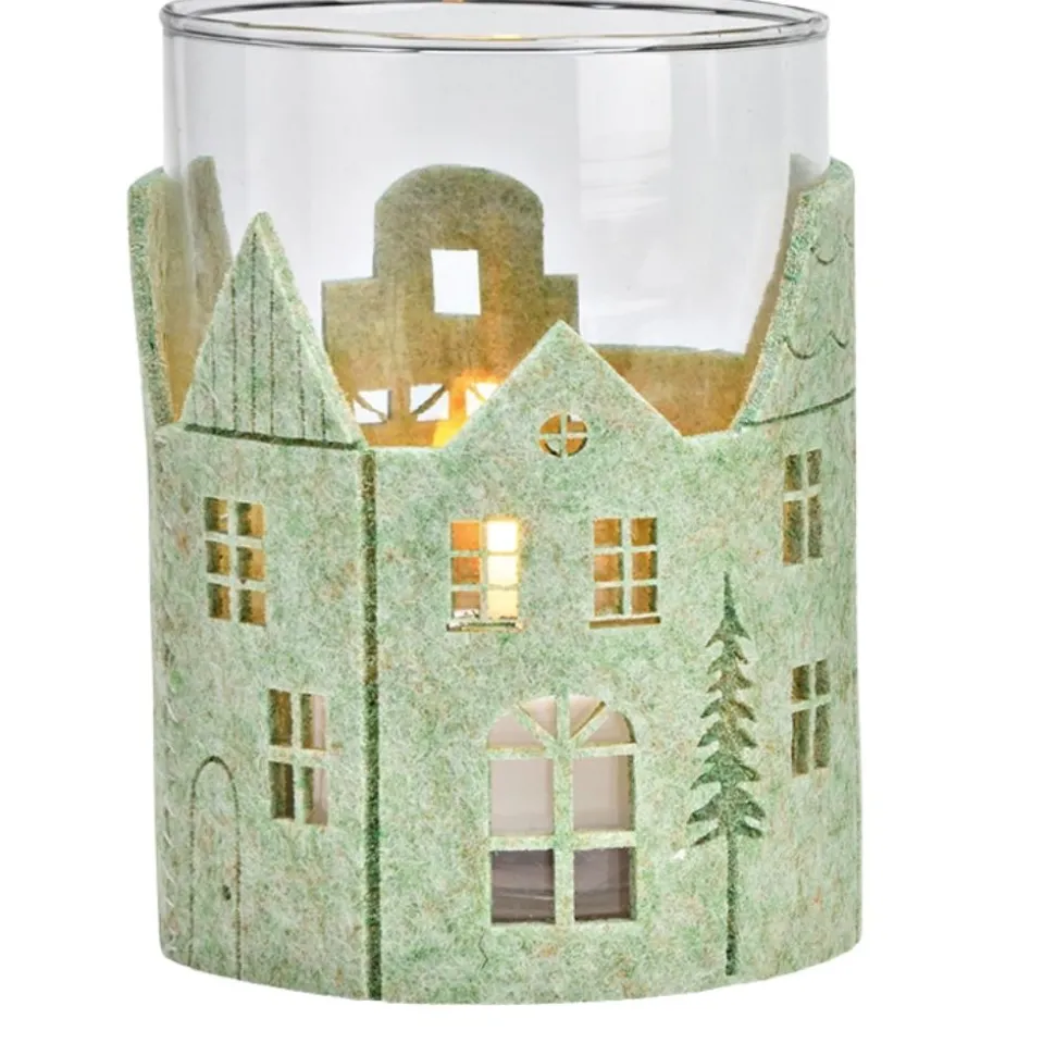 Dieses Windlicht besticht durch seine einzigartige Kombination aus Glas und hellgrüner Filzumrandung. Die Filzeinfassung ist mit feinen, eingestanzten Motiven von Häusern und Tannen verziert, die im Schein eines Teelichts wunderschön leuchten. Das Licht scheint durch die ausgeschnittenen Formen und zaubert ein warmes, gemütliches Ambiente.