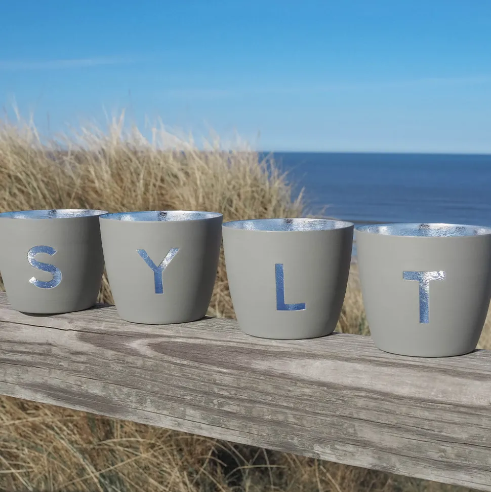 Bist Du auch so syltverliebt wie wir? Dann haben wir hier etwas ganz Tolles, um Dein Heim maritim zu stylen. Diese hellgrauen Madras im 4er-Set sehen schon unbeleuchtet einfach atemberaubend aus. Stelle ein Teelicht in jeden Becher und es erstrahlen genau die vier Buchstaben Deines Lieblingsortes, an dem Du Dich bestenfalls 12 Monate im Jahr aufhalten möchtest. Die silberfarbene Beschichtung im Inneren der Madras zaubert eine Wohlfühl-Atmosphäre in Dein Zuhause und lässt Dich in Sylt-Erinnerungen schwelgen. Übrigens…pssst, diese Madras erhältst Du exclusiv nur hier bei uns. Entdecke weitere Syltartikel hier in unserem Shop.