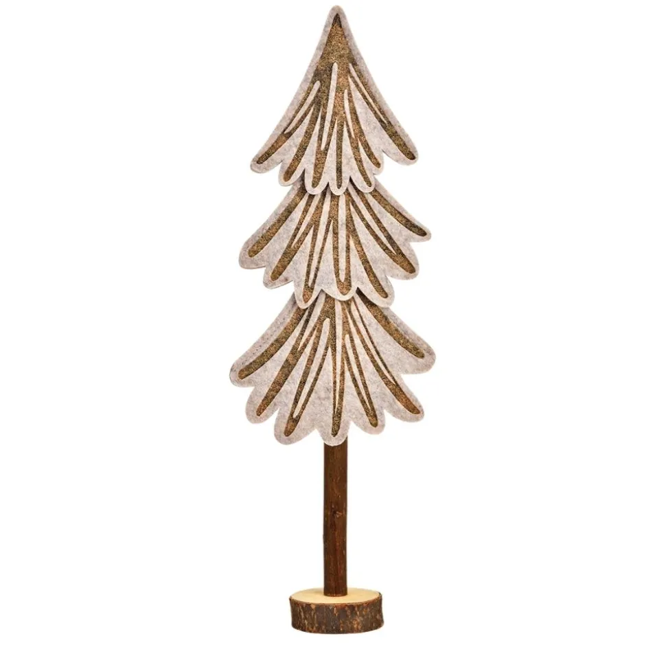 Der Tannenbaum aus Filz begeistert mit seinem nadelfreien Design und seiner natürlichen Optik. Die filigranen hellbraunen Details auf dem beigen Filz setzen einen schönen Kontrast und verleihen dem Baum eine warme, einladende Ausstrahlung. Für einen rustikalen Touch sorgt der Sockel aus einer echten Baumscheibe, der dem Aufsteller Stabilität und Charakter verleiht.