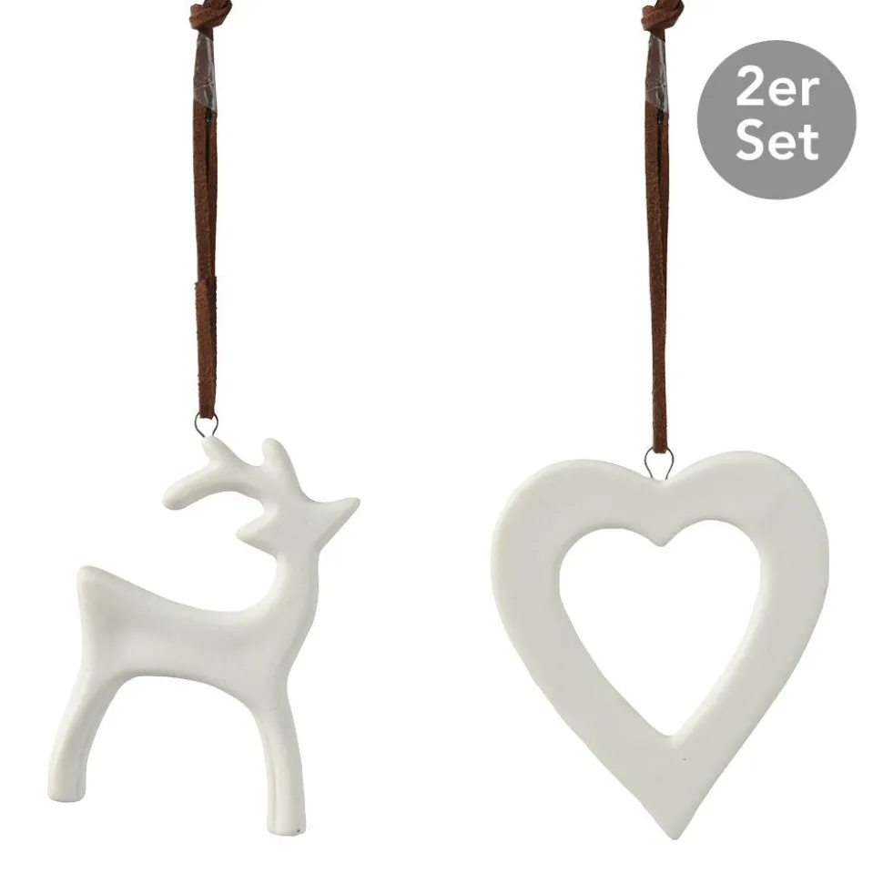 Verleihe Deinem Zuhause festlichen Glanz mit unserem zauberhaften 2er-Set wollweißer Dekohänger – ein eleganter Hirsch und ein liebevolles Herz. Die Hänger bestehen aus Porzellan und sind perfekt für den Weihnachtsbaum, als charmante Fensterdekoration oder als liebevolles Geschenk.