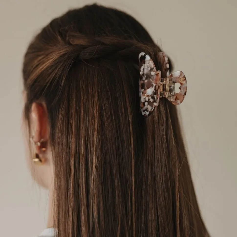 Die große Haarklammer von Eulenschnitt in der Farbe Almond vereint natürliche Eleganz mit praktischem Design. Das sanfte Weiß mit hellen Brauntönen verleiht der Haarklammer eine warme, harmonische Optik, die zu vielen Looks passt.Besonders auffällig ist das ausgefräste Herz, das genau an der Stelle sitzt, an der du die Haarklammer anfässt. Dieses filigrane Detail macht das Öffnen und Schließen der Klammer zu einem besonderen Erlebnis und verleiht dem Accessoire eine verspielte und liebevolle Note.Mit ihrer großzügigen Größe bietet die Haarklammer sicheren Halt, selbst bei vollem oder dickem Haar. Sie hält deine Frisur zuverlässig an Ort und Stelle, während das Herz an der Griffstelle für einen besonderen Blickfang sorgt.Die Kombination aus hochwertiger Verarbeitung, zeitlosem Design und dem einzigartigen Herzmotiv macht diese Haarklammer zu einem Must-have für alle, die natürlichen Stil mit einem kleinen, charmanten Detail lieben.Ob für den Alltag oder besondere Anlässe, die große Haarklammer Herz Almond von Eulenschnitt rundet dein Styling perfekt ab und verbindet Funktionalität mit einem liebevollen Design.