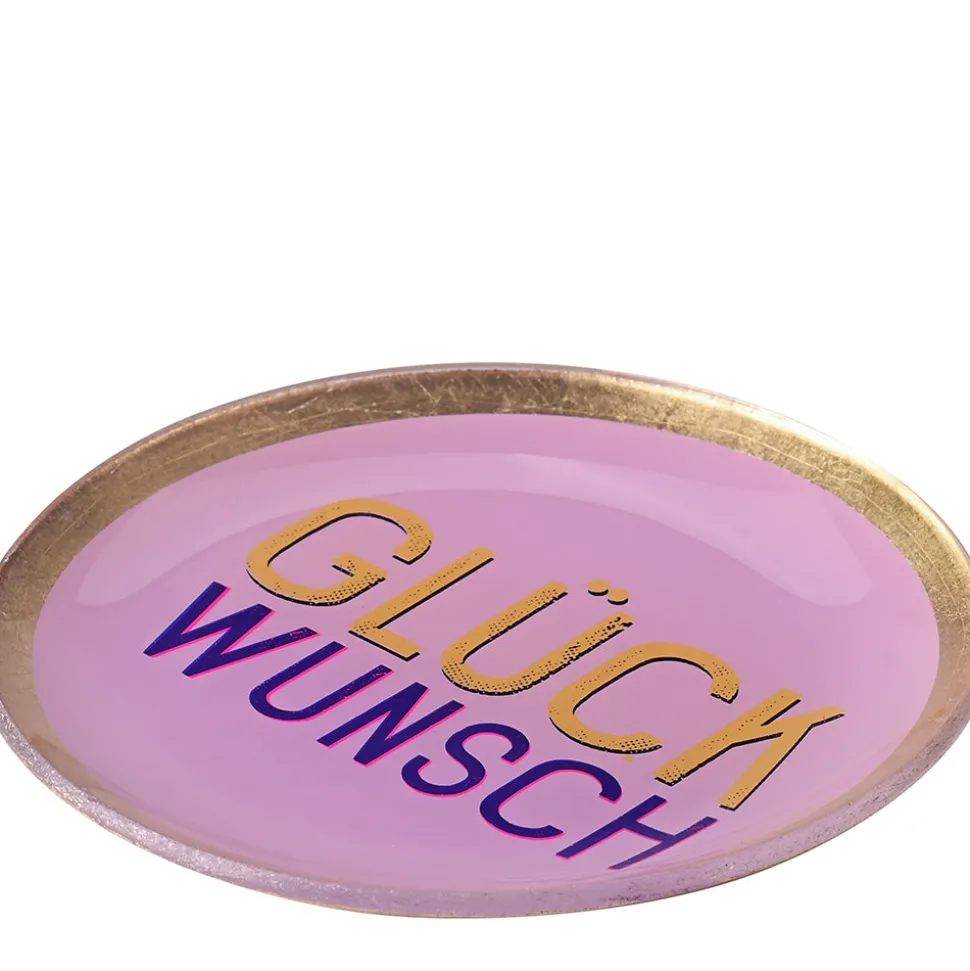 Wenn es etwas zu feiern gibt, dann wünsche die besten Glückwünsche doch mit diesem schicken Glasteller! Die Botschaft des rosafarbenen Tellers wird vor allem durch den goldfarbenen Rand hervorgehoben und um diese als kleine Überraschung zu halten, kannst Du den 13 cm großen Teller aus Glas einfach mit etwas Naschereien bedecken! So erahnt die beschenkte Person nicht direkt, was Du ihr liebes sagen möchtest!