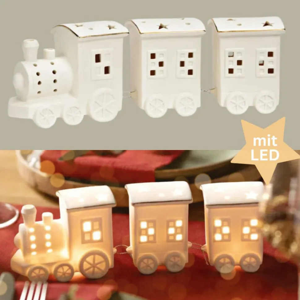 Der Porzellan Zug mit LED-Beleuchtung ist nicht nur eine wunderschöne Deko, sondern auch ein kleines Stück Kindheitserinnerung. Er erinnert an gemütliche Abende, den Duft von Plätzchen und das leise Knistern im Kamin. Kleiner Tipp: Auch nach dem Fest wirkt der Zug noch heimelig in deinem Wohnzimmer.