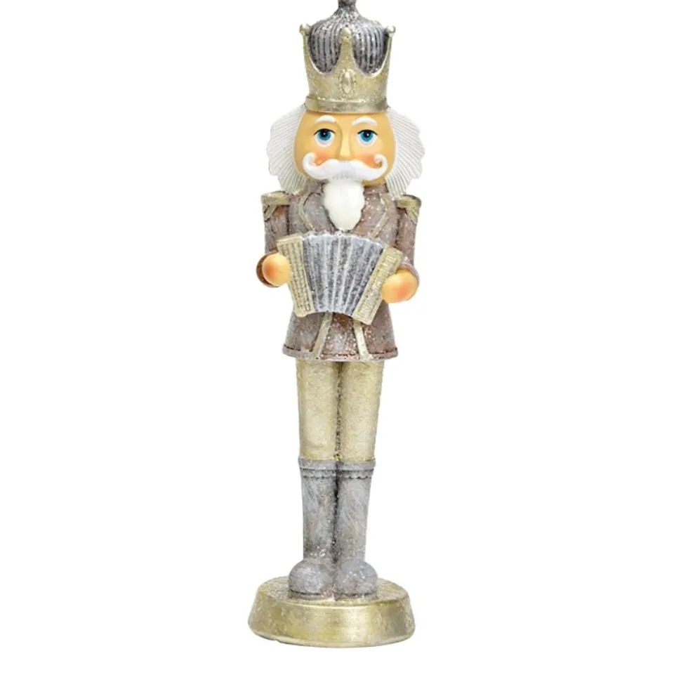 Sein Aussehen erinnert an eine Szene aus einem verschneiten Weihnachtsdorf: ein Musiker, der sich dem kalten Wind entgegenstellt und mit seinem Spiel eine besondere Stimmung verbreitet. Die feinen Details wie die strukturierte Uniform, die silberfarbenen Akzente und die sorgfältig modellierte Ziehharmonika machen diesen Nussknacker zu einem echten Blickfang.