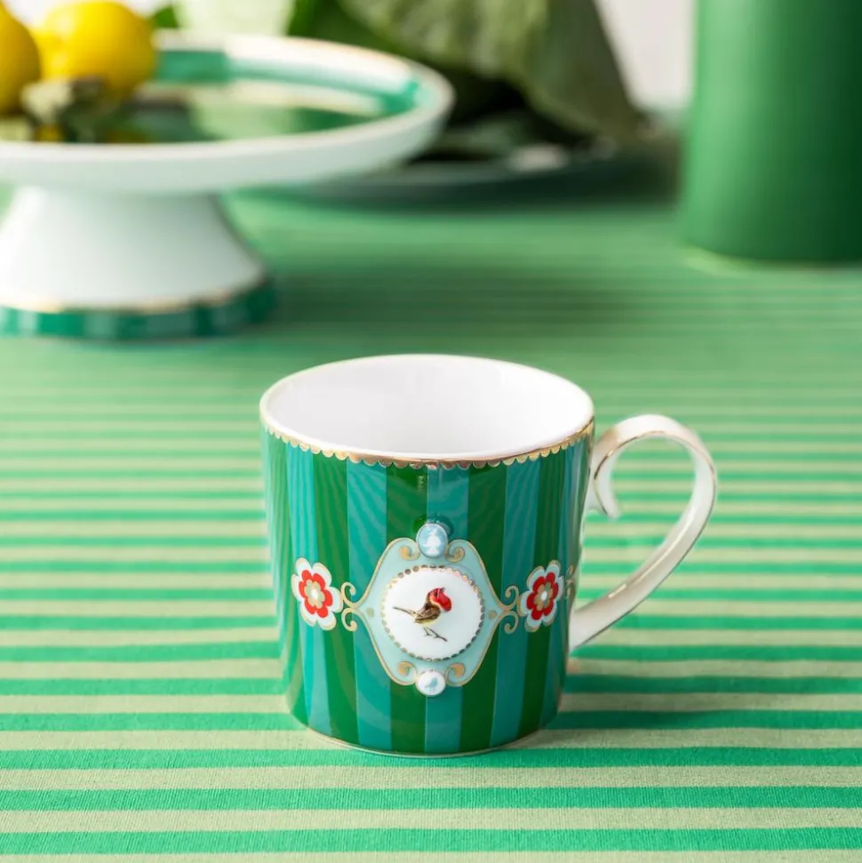 Klein, aber oho! Die Tasse Love Birds von Pip Studio wird Dich sofort begeistern. Auf grün gestreiftem Grund findest du ein fein verziertes Medaillon mit einem wunderschönen Rotkehlchen in der Mitte. Natürlich dürfen auch die für Pip typischen goldfarbenen Details auf dem Porzellan nicht fehlen. Verliebe auch Du Dich in die neue Love Birds Kollektion von Pip Studio.