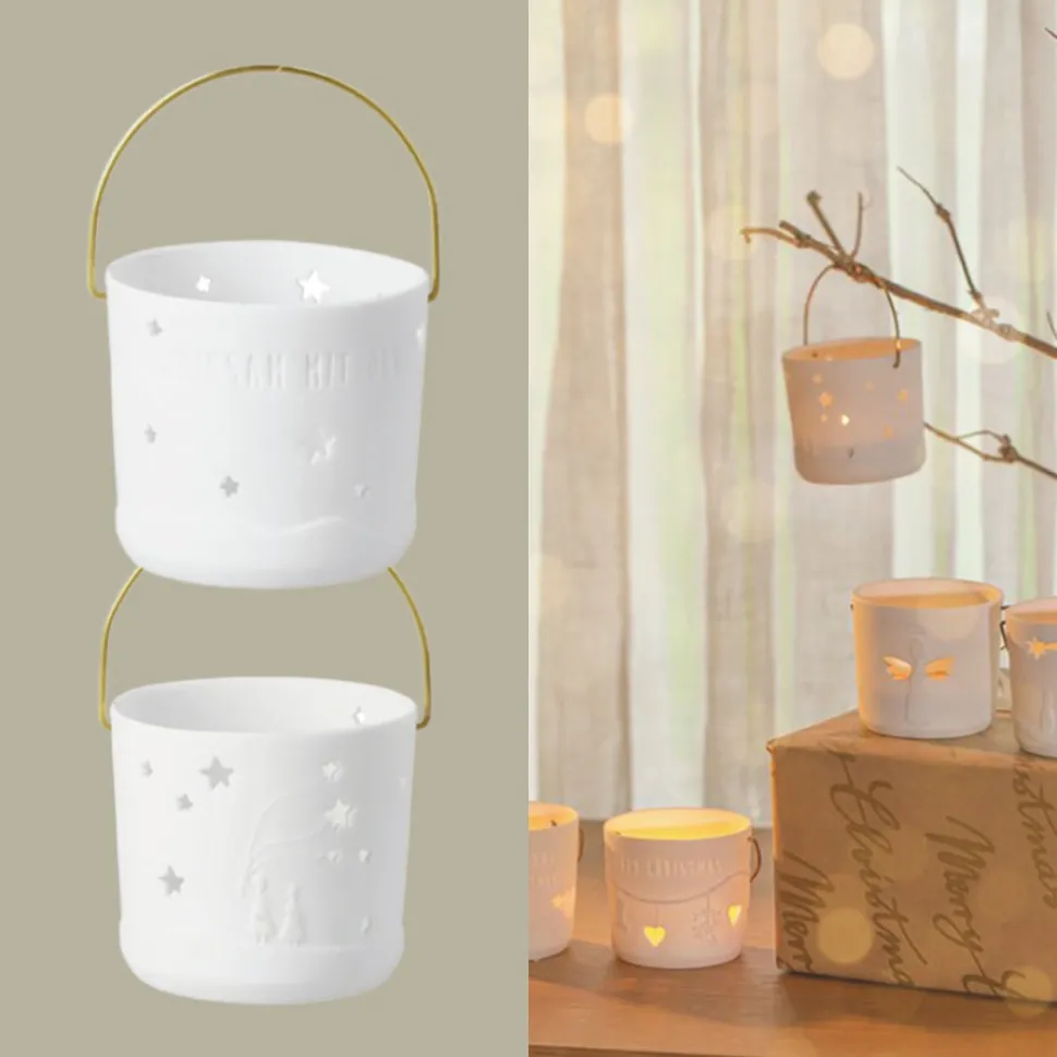Die kleine Laterne aus Porzellan findet mit ihrer Höhe von 5,5 cm und ihrem Durchmesser von 6 cm überall Platz. Ob im Regal, auf einem Schrank oder Tisch oder auf der Fensterbank. Dank ihres Henkels aus Messingdraht kann man sie sogar aufhängen. Sie bietet ihrerseits Platz für ein Teelicht oder ein LED und spendet so ein bezauberndes Licht, das durch die sternförmigen Löcher nach außen dringen kann.