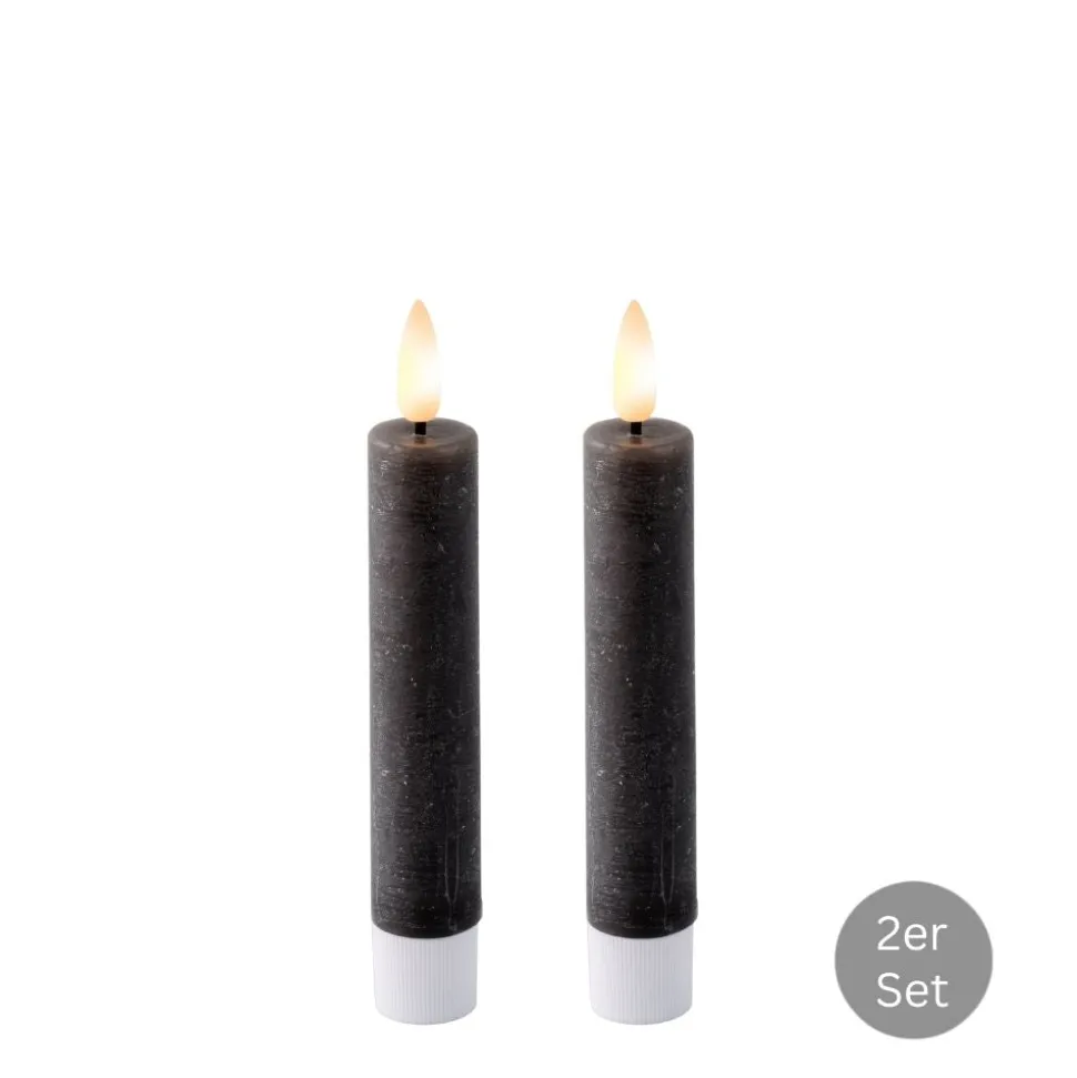 Die graue Farbgebung wirkt zeitlos und passt zu unterschiedlichsten Einrichtungsstilen – von klassisch bis modern. Dank der schlanken Form erinnern sie optisch an traditionelle Tafelkerzen und erzeugen dennoch durch ihr sanftes LED-Licht eine warme, gemütliche Atmosphäre. Das flackernde Licht imitiert das natürliche Kerzenflackern sehr realistisch und schafft ein behagliches Ambiente, ganz ohne Ruß oder Wachstropfen.
