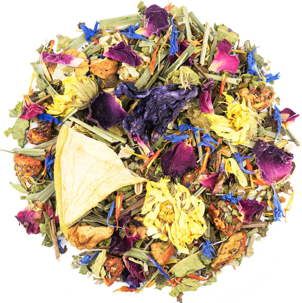 Zutaten: Apfelstücke gesäuert (Apfel, Säuerungsmittel: Zitronensäure), Apfelstücke, Zitronengras, Zitronenverbene, Fenchel, Walderdbeerblätter, Brombeerblätter, Apfelspalten, Aroma, süße Brombeerblätter, gefr.-getr. Birnenstücke, Färberdisteln, ganze Ringelblumen, Rosenblüten, blaue Kornblumenblüten, Malvenblüten.