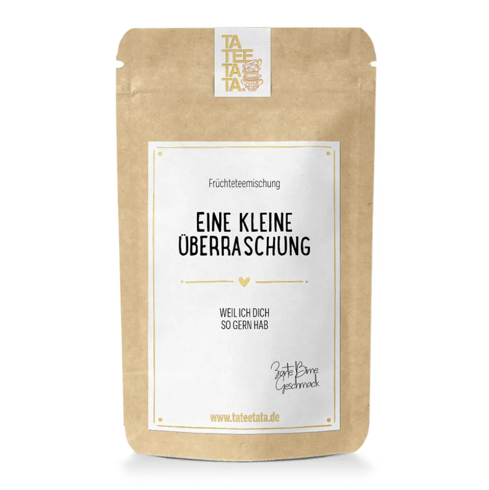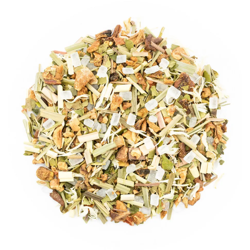 Geröstete Birnenstücke (22%), Apfelstücke, Kluntinchen, Mate grün, Zitronengras, Aroma, Kornblumenblüten.