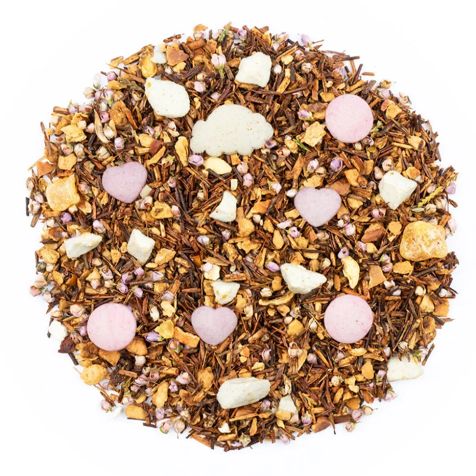 Rotbuschtee, Apfelstücke, Mangowürfel (Mango, Zucker), Zuckerwolken-Konfetti-Herzen-Mix (Zucker, Kartoffelstärke, Sonnenblumenöl, Reismehl, Färbende Lebensmittel: Konzentrat aus Karotte, Heidelbeere, Rettich, Apfel, schwarze Johannisbeere, Überzugsmittel: Carnaubawachs), Heidekrautblüten, gefr.-getr. Joghurtgranulat (Magermilchjoghurt, Zucker, Maltodextrin, modifizierte Stärke, Säurungsmittel: Zitronensäure), Aroma, Granatapfelkerne.