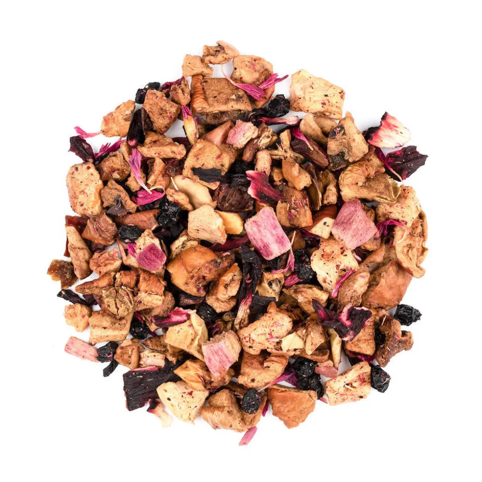 Zutaten: Apfelstücke, Apfelwürfel, Hibiskusblüten, Fliederbeeren, Aroma, Hagebuttenschalen, gefr.-getr. Rhabarberstücke, rosa Kornblumenblüten.