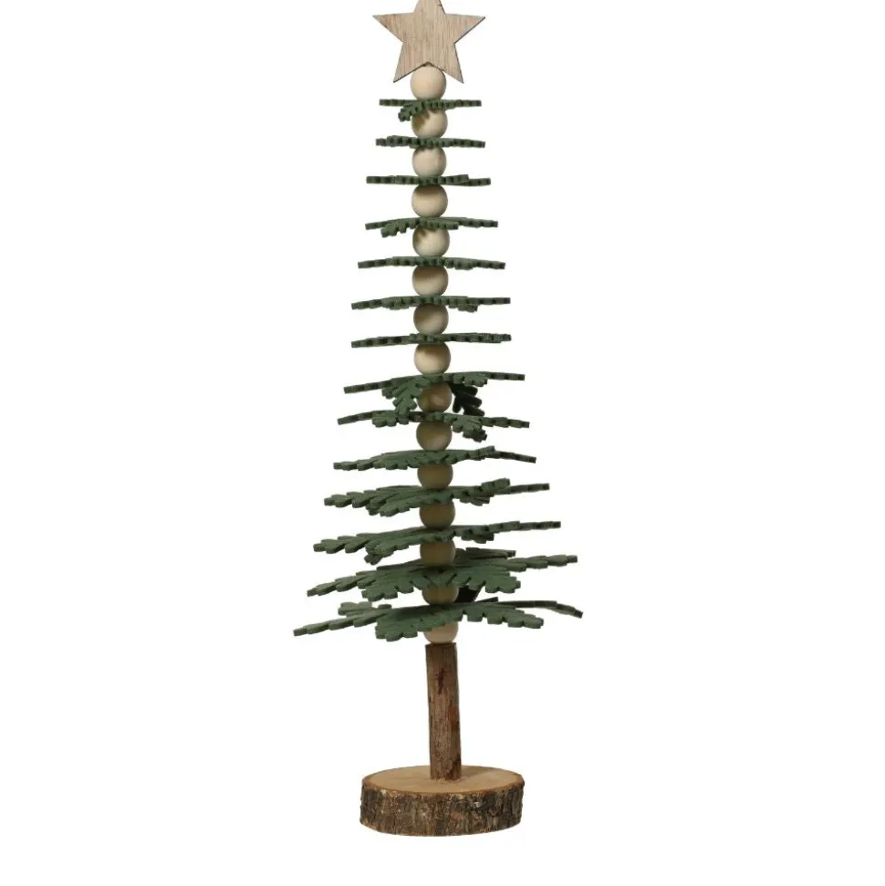 Suchst Du nach einem echten Hingucker für Deine Weihnachtsdeko? Dann ist dieser zauberhafte Weihnachtsbaum genau das Richtige für Dich! Mit seinen 37,5 cm Höhe ist er groß genug, um ins Auge zu fallen, aber klein genug, um überall einen Platz zu finden.Die Zweige aus grünem Filz wirken super kuschelig und weich – fast so, als könntest Du sie streicheln! Der Stamm besteht aus liebevoll aufgereihten Holzperlen, die dem Baum einen natürlichen, rustikalen Charme verleihen. Und obenauf sitzt die hübsche Holzstern-Spitze, die dem Baum den perfekten festlichen Glanz verleiht.Du kannst den Baum auf dem Sideboard, Fensterbrett oder als süßes Highlight auf Deinem Weihnachtstisch platzieren. Er bringt sofort diese warme, gemütliche Weihnachtsstimmung ins Zimmer und zaubert Dir garantiert ein Lächeln ins Gesicht.Ob solo oder in Kombination mit anderen Deko-Elementen – der Filz-Weihnachtsbaum macht immer eine tolle Figur. Vielleicht dekorierst Du ihn mit kleinen Kugeln, Lichterketten oder sternförmigen Anhängern? Deiner Kreativität sind keine Grenzen gesetzt!Hol Dir jetzt diesen kleinen grünen Weihnachtszauber nach Hause und lass Dich von seinem charmanten Stil verzaubern. Weihnachten kann kommen – und Dein Zuhause ist schon bestens vorbereitet!