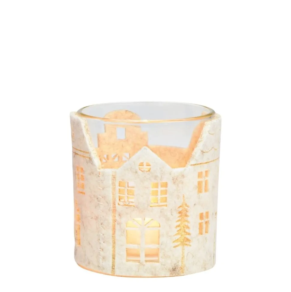 Dieses stimmungsvolle Windlicht kombiniert edles Glas mit einem weißen Filzrahmen und bringt eine sanfte winterliche Atmosphäre in dein Zuhause. In den Filz sind liebevoll kleine Häuser und Tannen eingestanzt die bei Kerzenschein besonders schön zur Geltung kommen. Sobald ein Teelicht im Inneren brennt leuchtet das Licht durch die feinen Ausstanzungen und lässt eine kleine Winterlandschaft lebendig wirken.